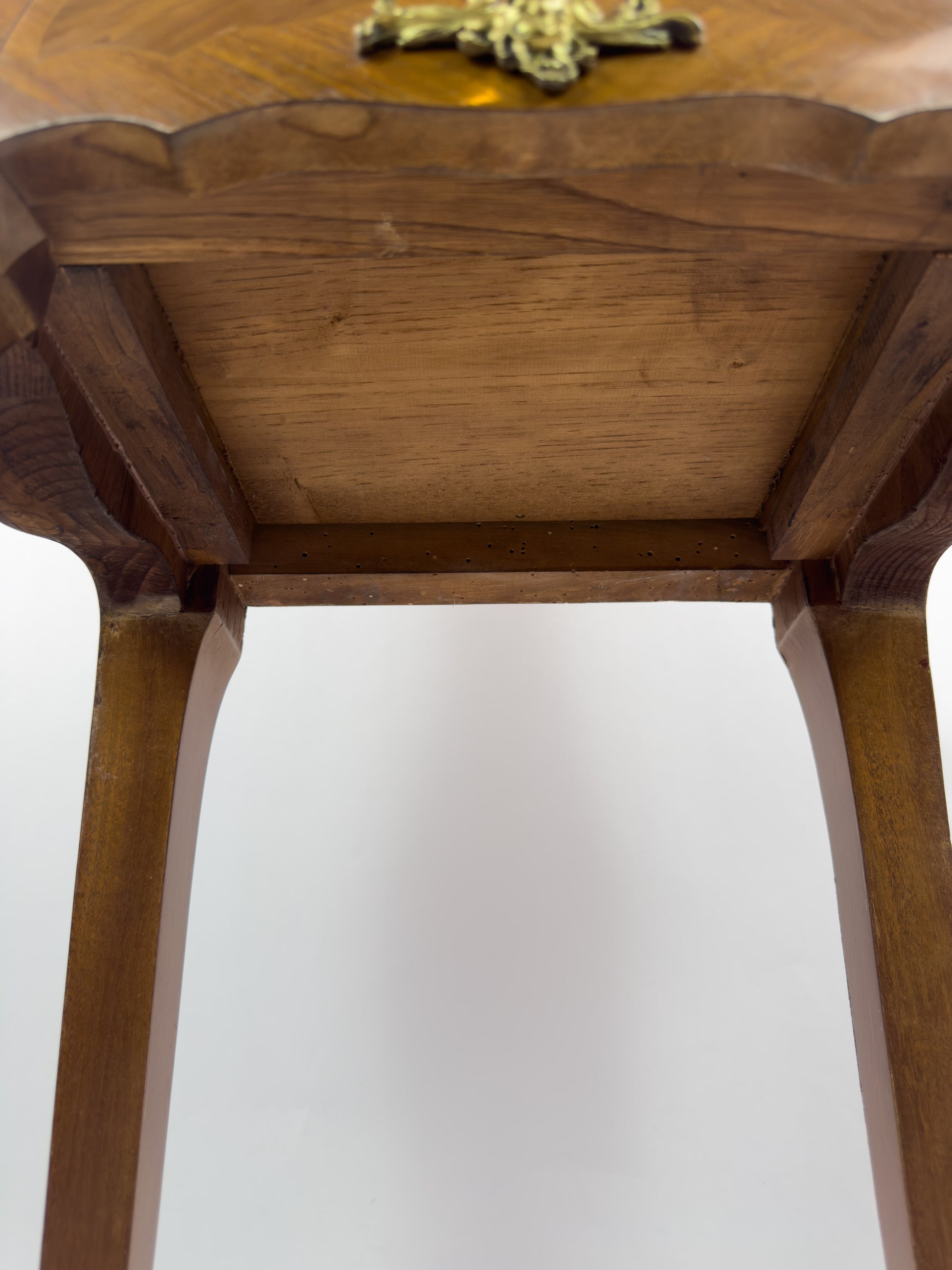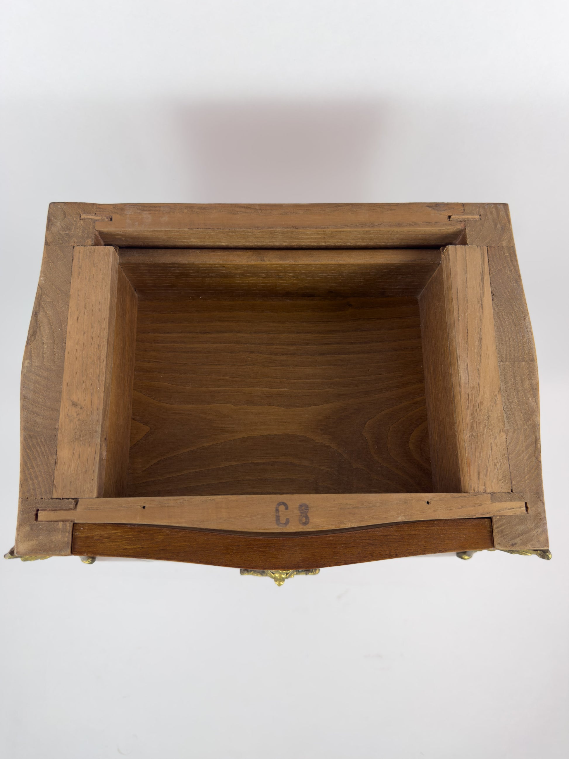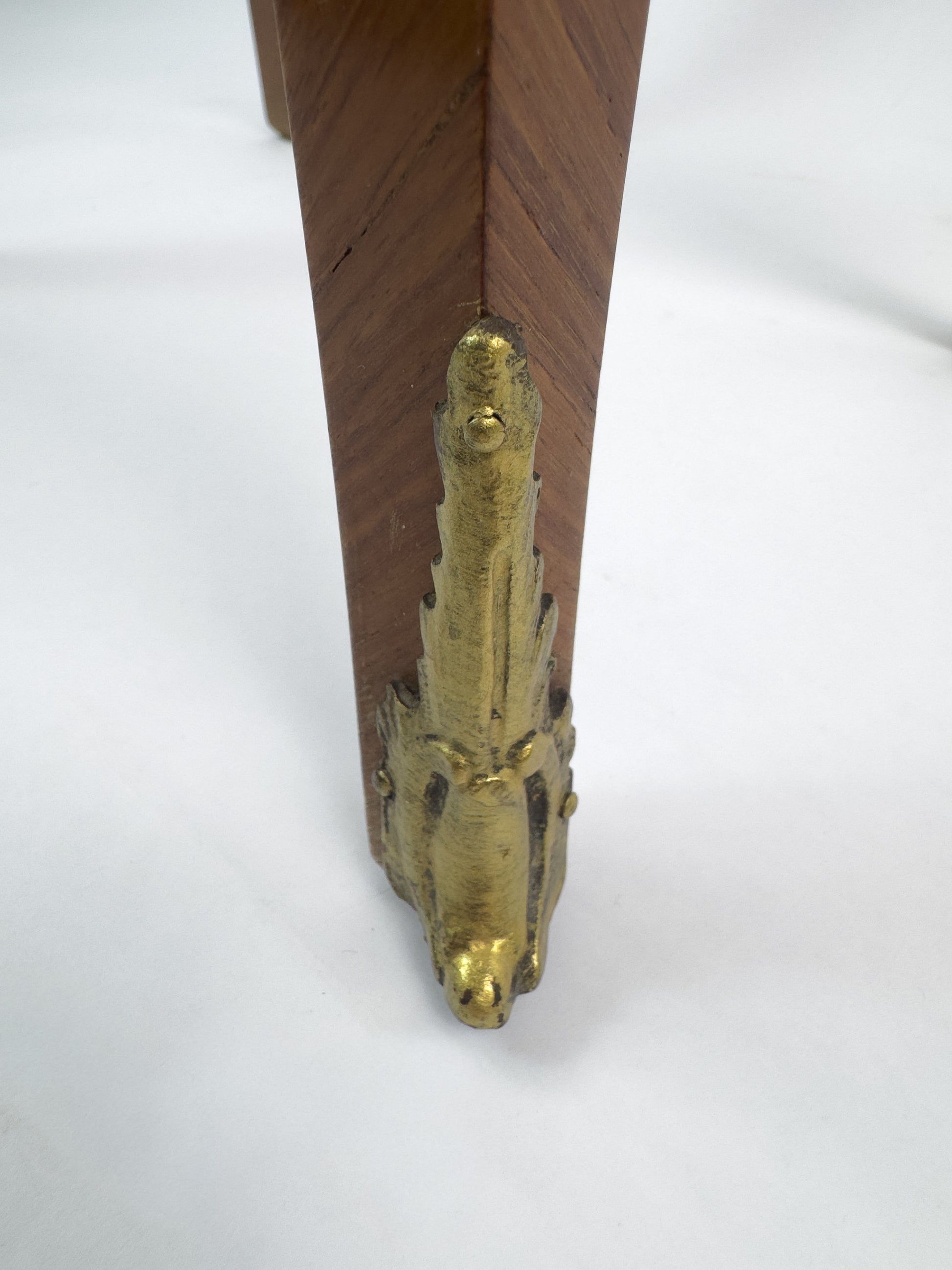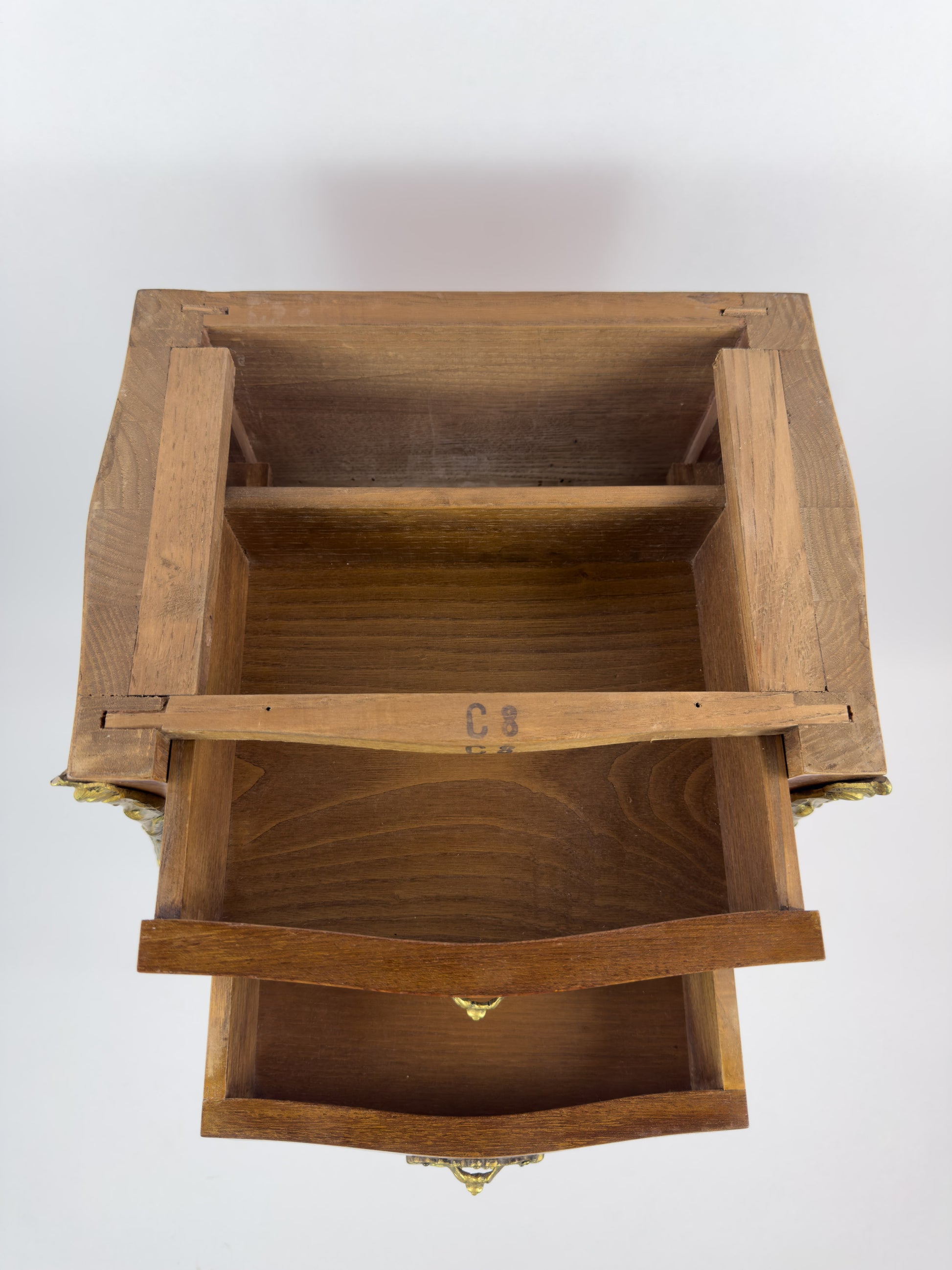 Two drawers are constructed in traditional queue d’aronde (dovetail) joinery. The elegant gilt mounts and sabots reinforce the restrained neoclassical Empire aesthetic while maintaining refined proportions suitable for both classical and contemporary interiors.