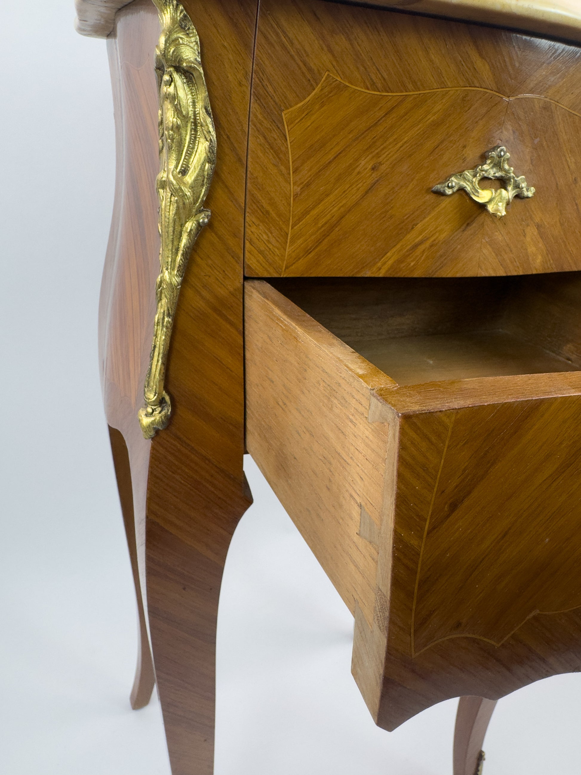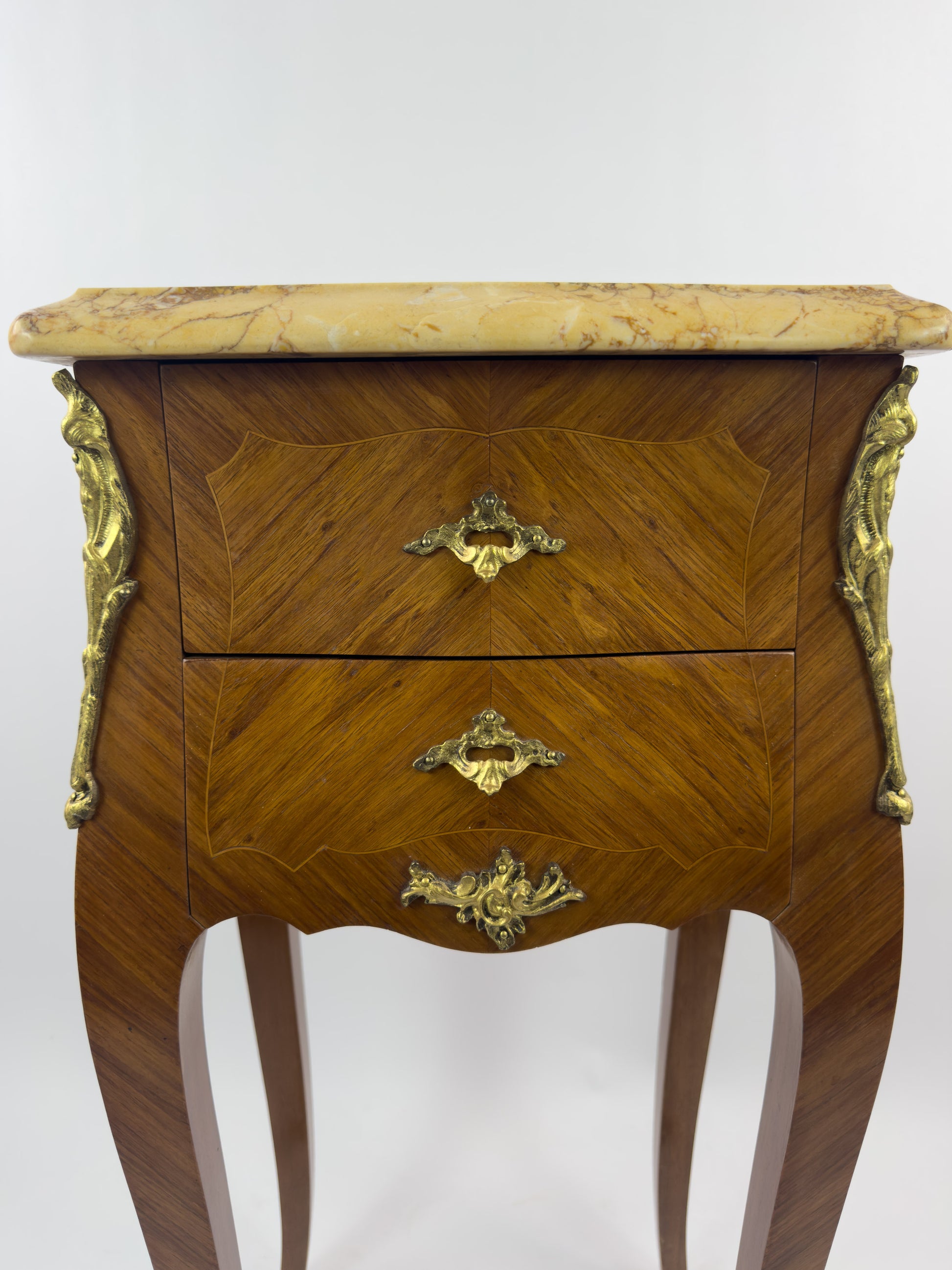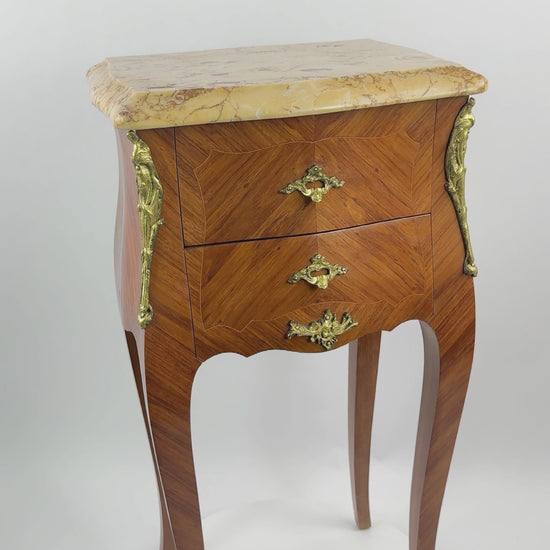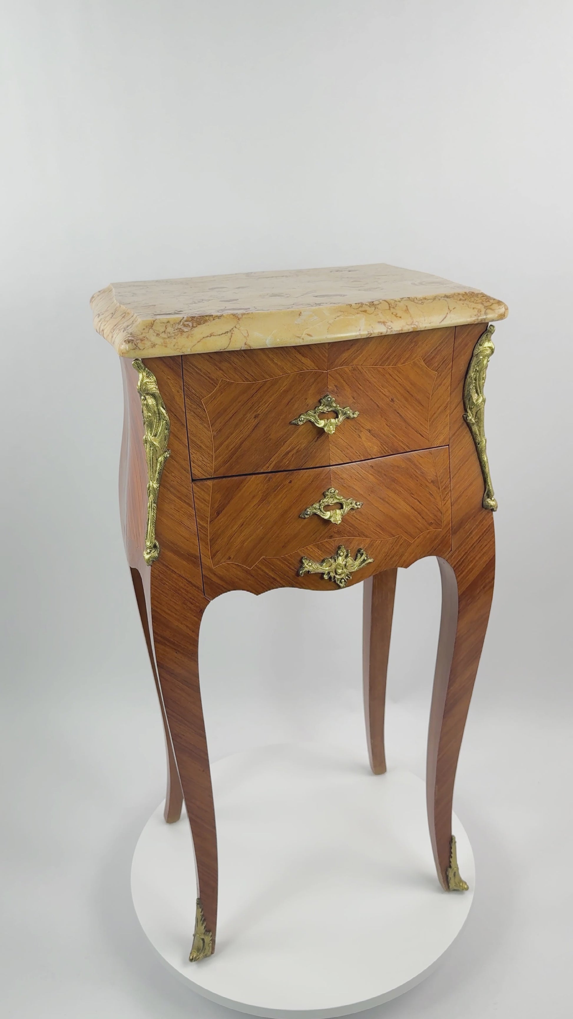 Two drawers are constructed in traditional queue d’aronde (dovetail) joinery. The elegant gilt mounts and sabots reinforce the restrained neoclassical Empire aesthetic while maintaining refined proportions suitable for both classical and contemporary interiors.