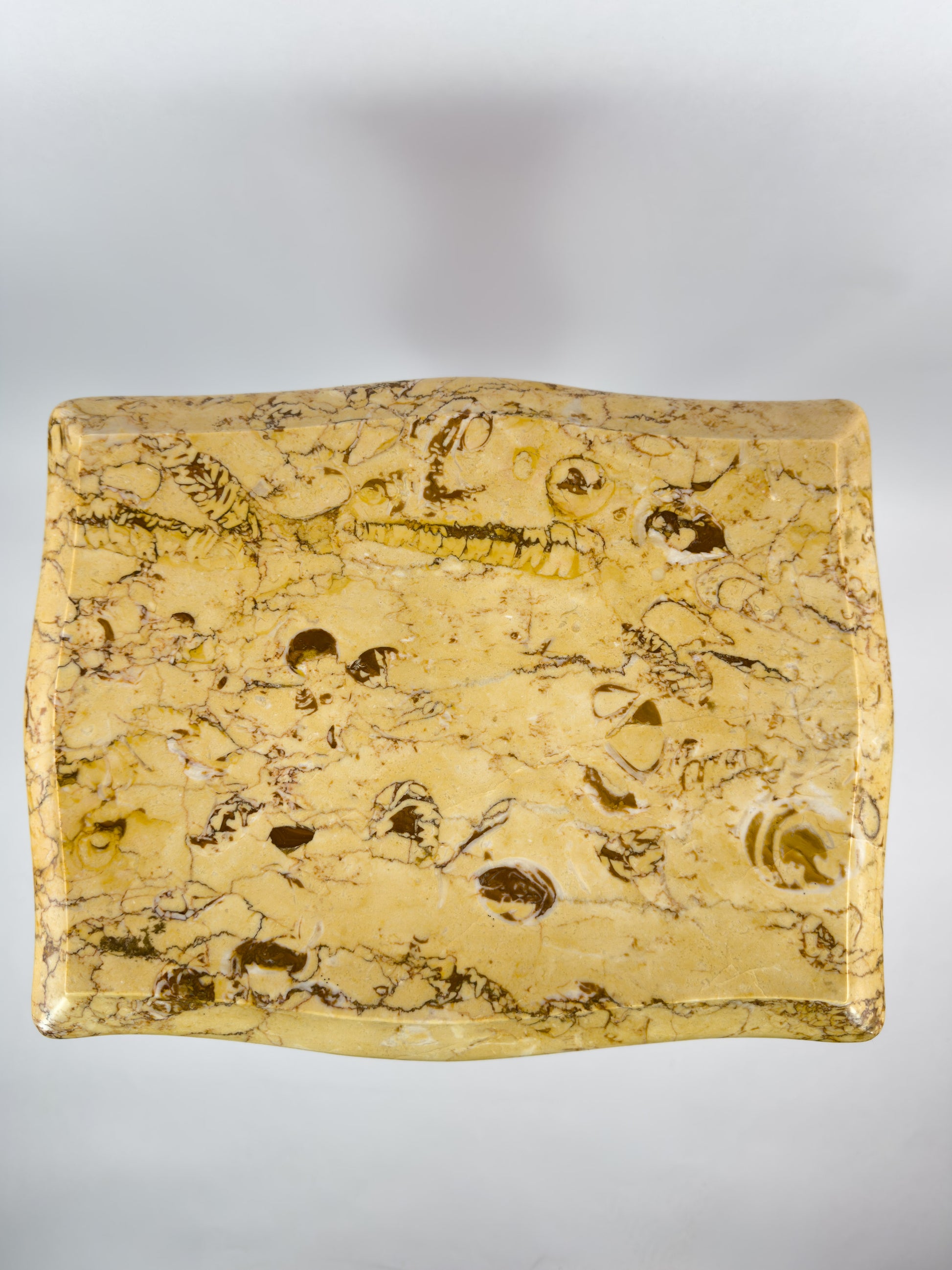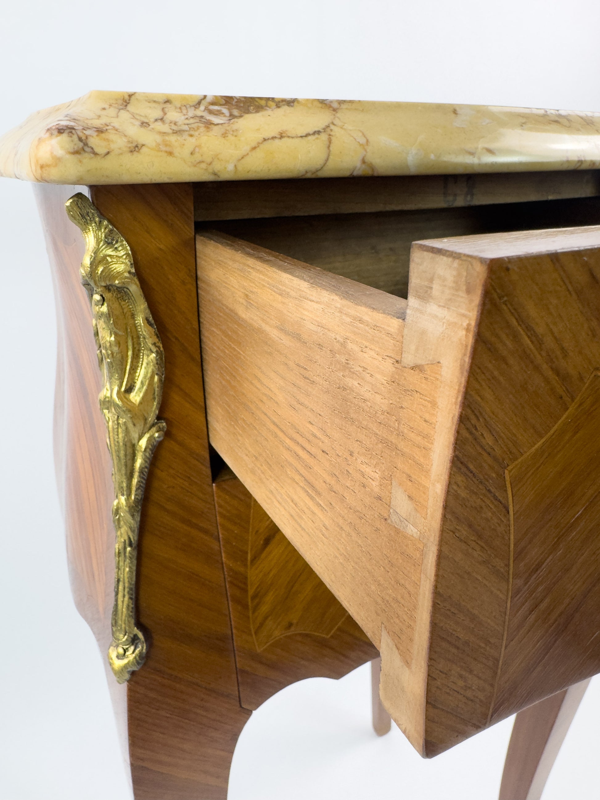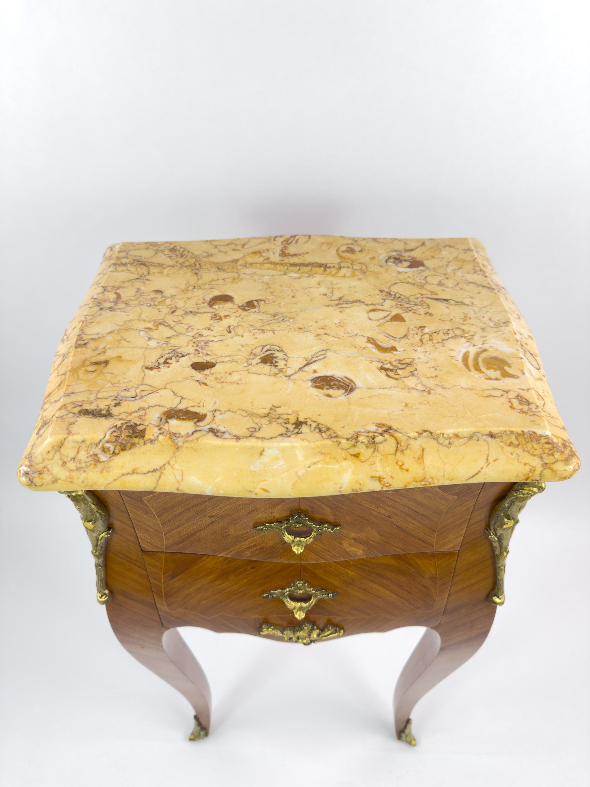 The warm ochre and cream tones of the thick marble top complement the rich mahogany veneer arranged in symmetrical chevron patterns across the façade. The marble slab is particularly heavy and rests securely in place without adhesive, consistent with traditional cabinetmaking practices and allowing for safe transport and conservation.
