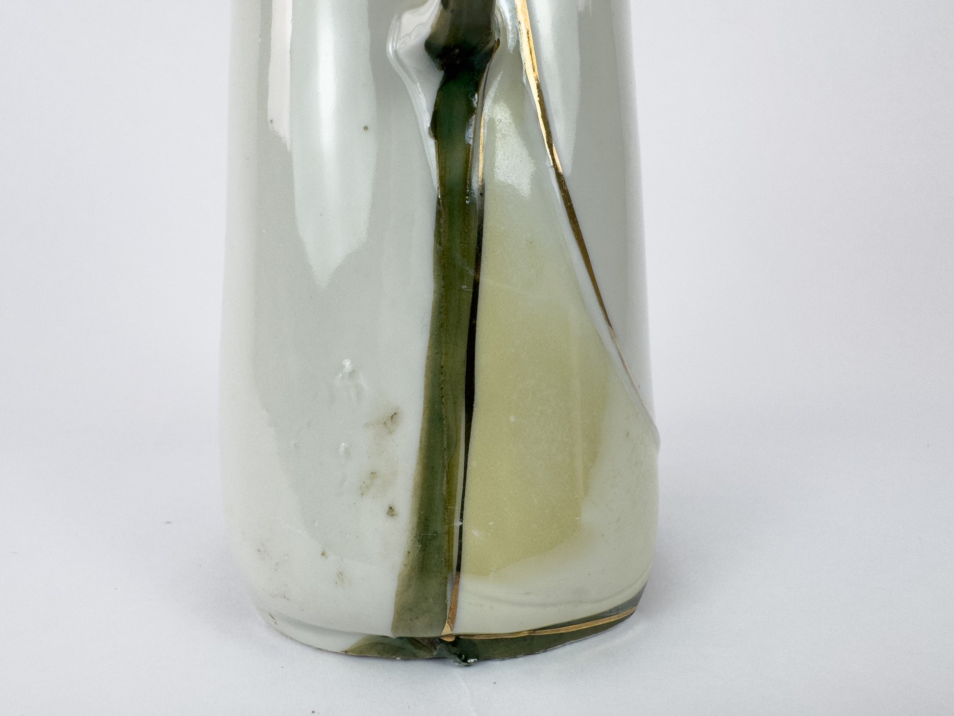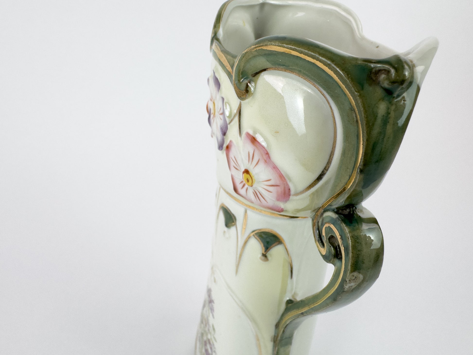 The cream-toned ground is subtly shaded with pale green hues at the base and neck. The upper section is adorned with lightly raised enamelled flowers, while the body displays a finely hand-painted floral bouquet in soft tones of mauve, white, yellow, and green. Gilded outlines emphasize the contours and decorative elements, adding refinement and visual depth.