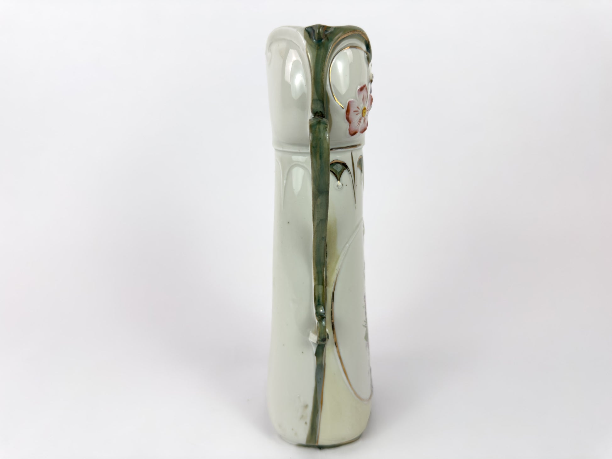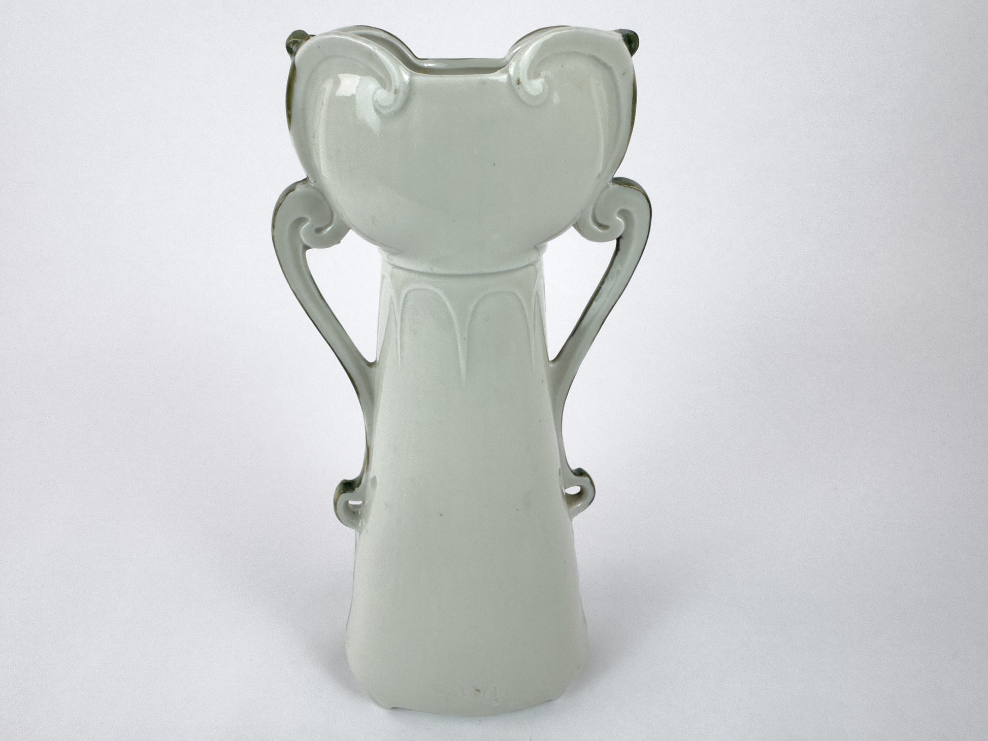 This elegant antique porcelain vase dates from the Art Nouveau period, circa 1890–1910, and reflects the Jugendstil aesthetic through its flowing form and floral ornamentation. The vase features a softly flared silhouette with two stylized handles inspired by vegetal motifs, accented with delicate gilding.
