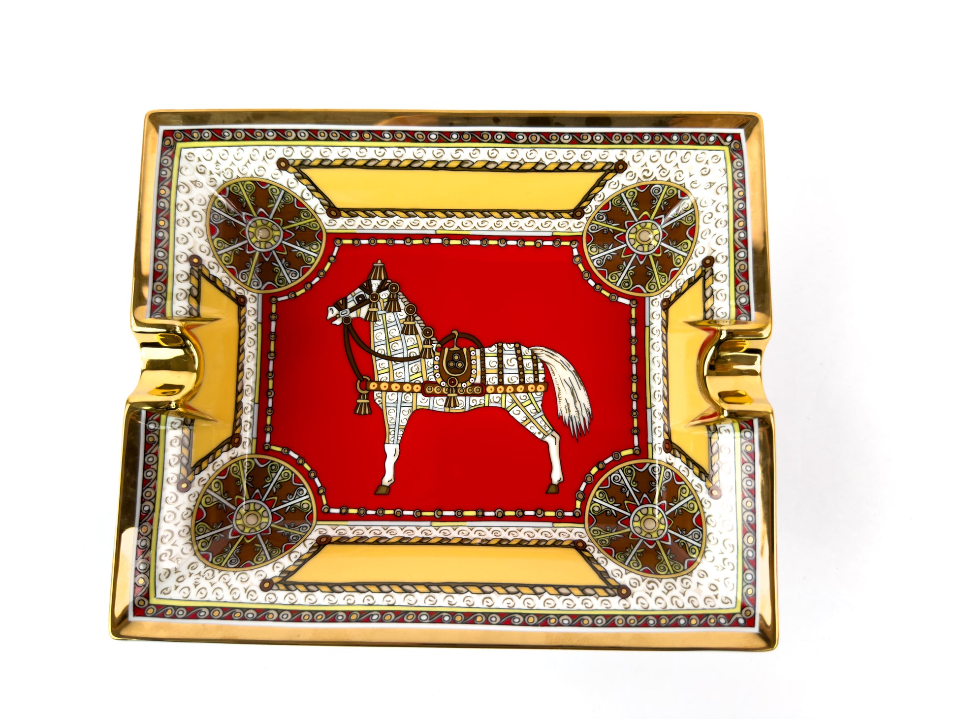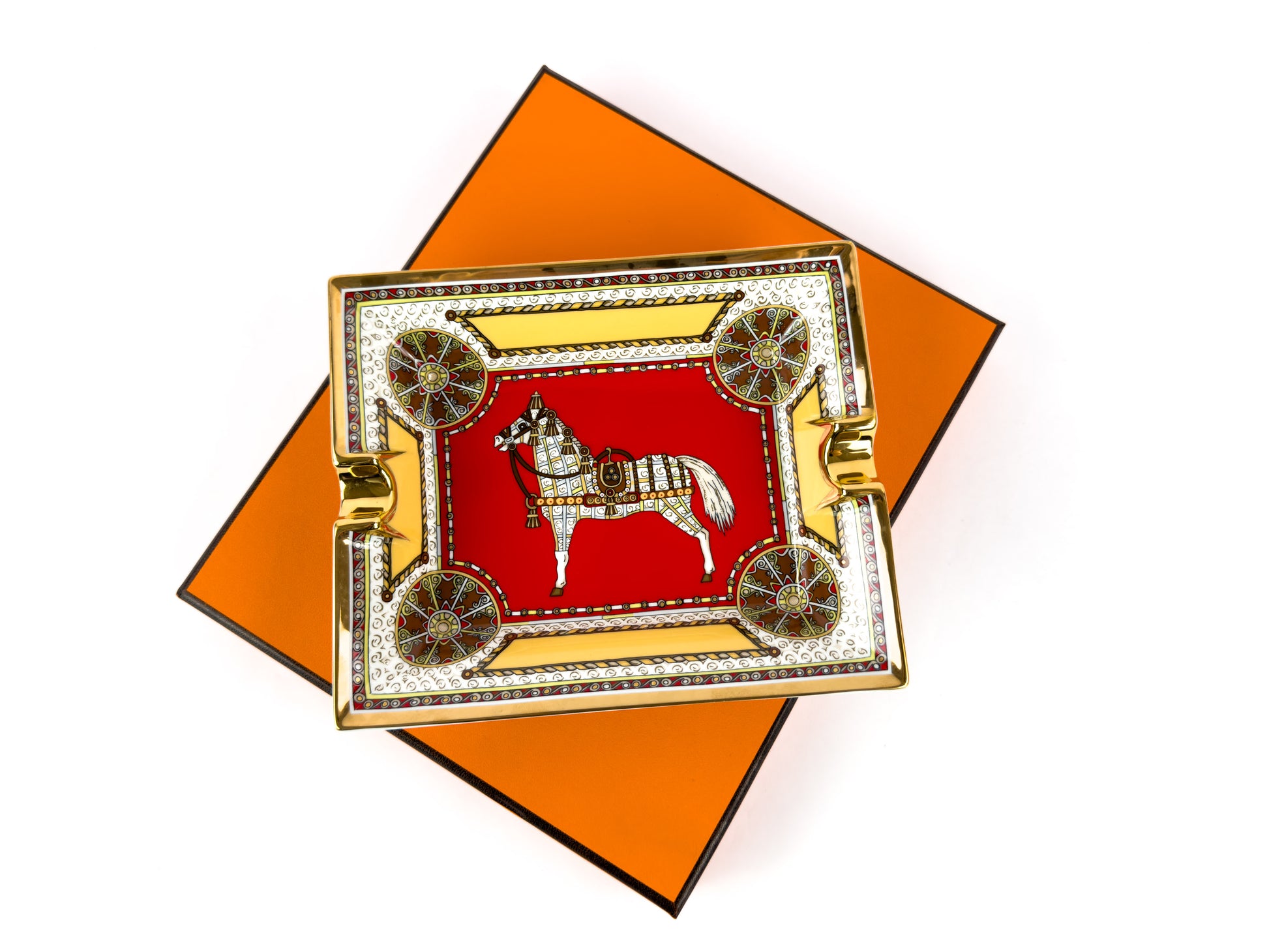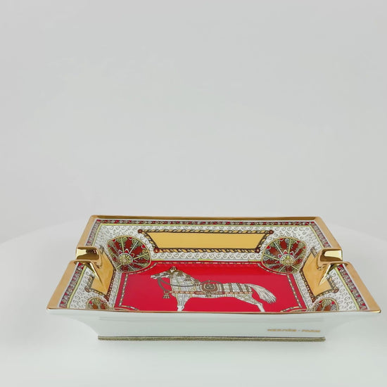 This Hermès Paris porcelain ashtray belongs to the discontinued Cheval d’Orient (“Horse of the Orient”) collection, an earlier Hermès porcelain line celebrating the house’s equestrian heritage through richly ornamented motifs and bold color palettes.