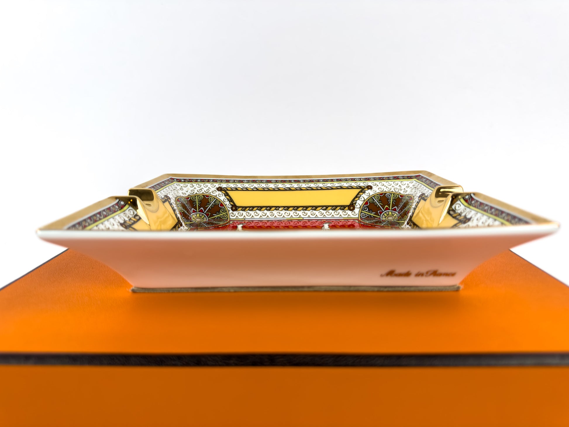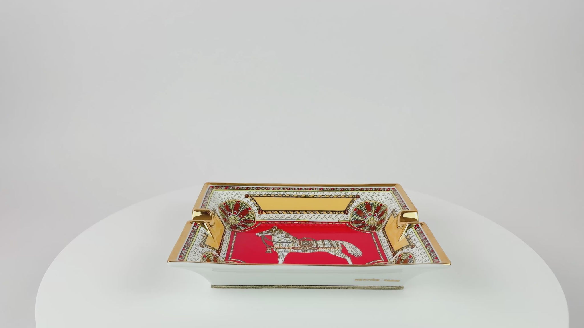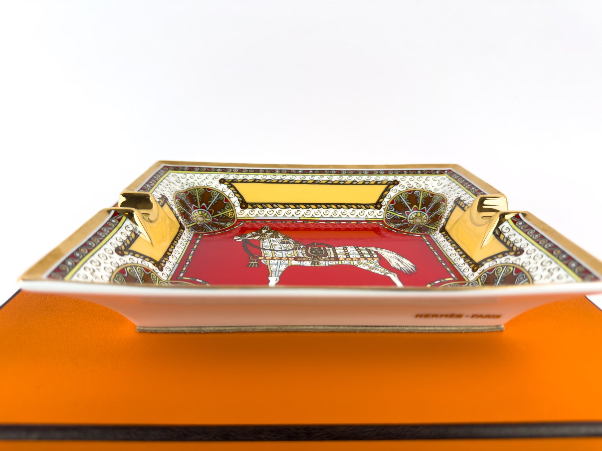 This Hermès Paris porcelain ashtray belongs to the discontinued Cheval d’Orient (“Horse of the Orient”) collection, an earlier Hermès porcelain line celebrating the house’s equestrian heritage through richly ornamented motifs and bold color palettes.