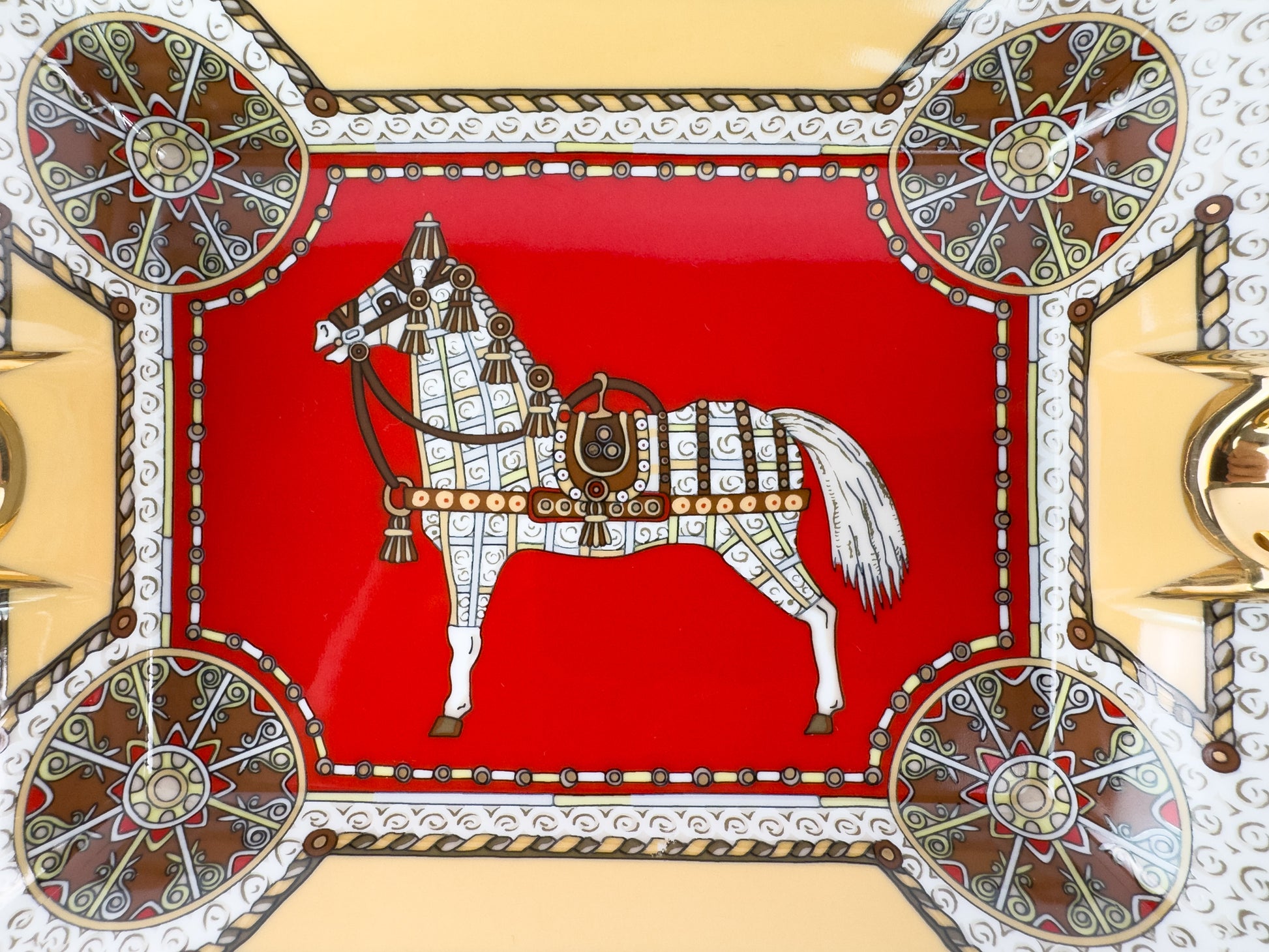 The design features a stylized horse set within a decorative composition of wheels and geometric borders in vibrant red, gold, and cream tones. Crafted in glazed porcelain with a generously gilded rim, the piece demonstrates the high level of finish and graphic precision characteristic of Hermès decorative objects.