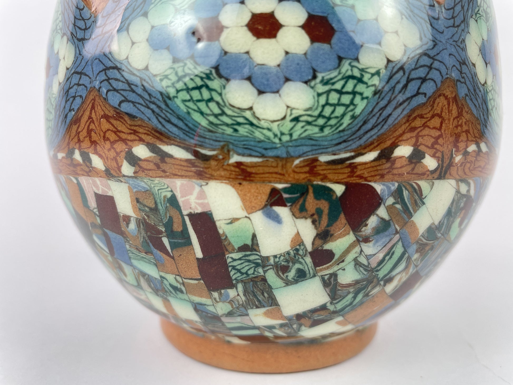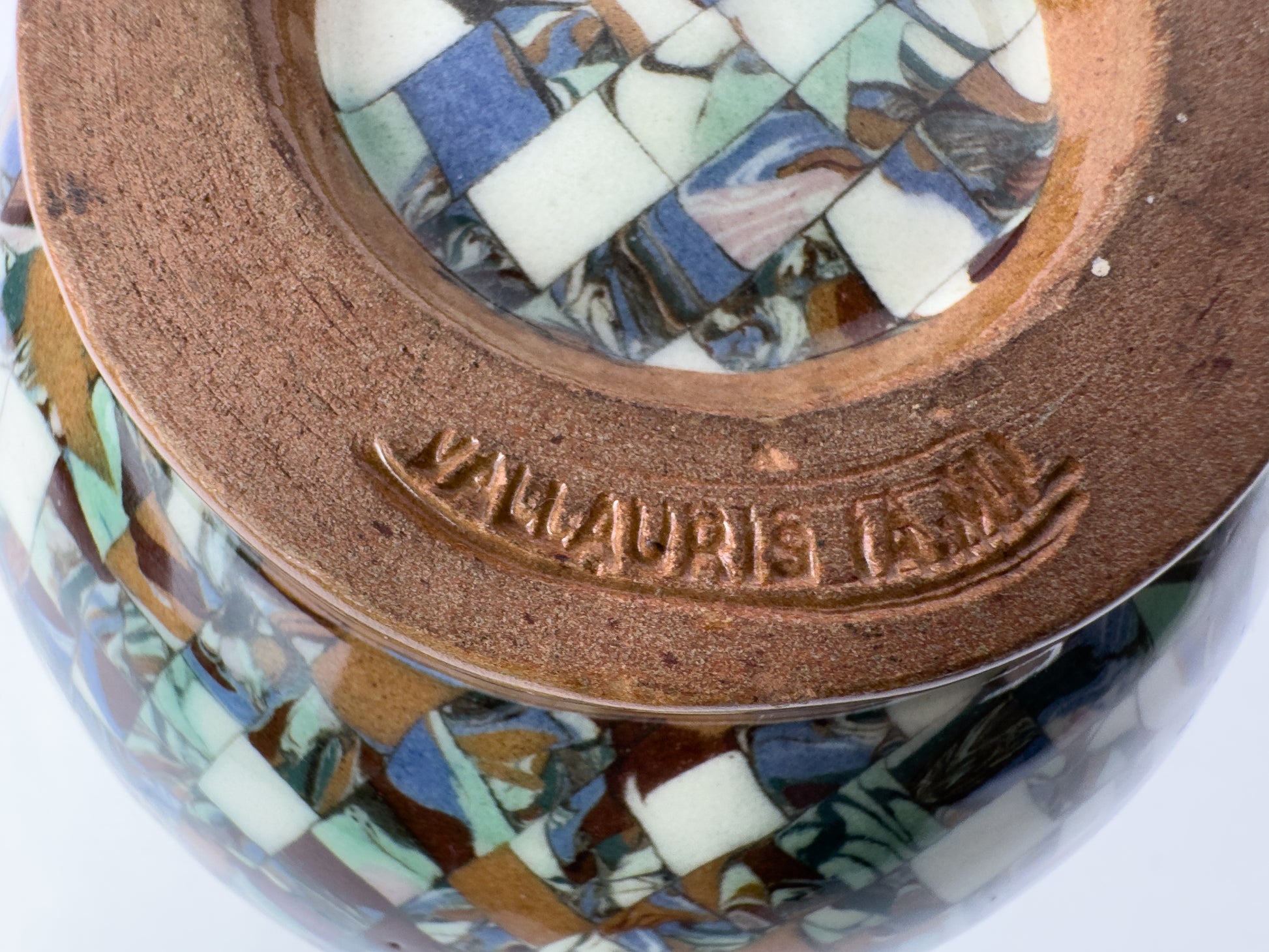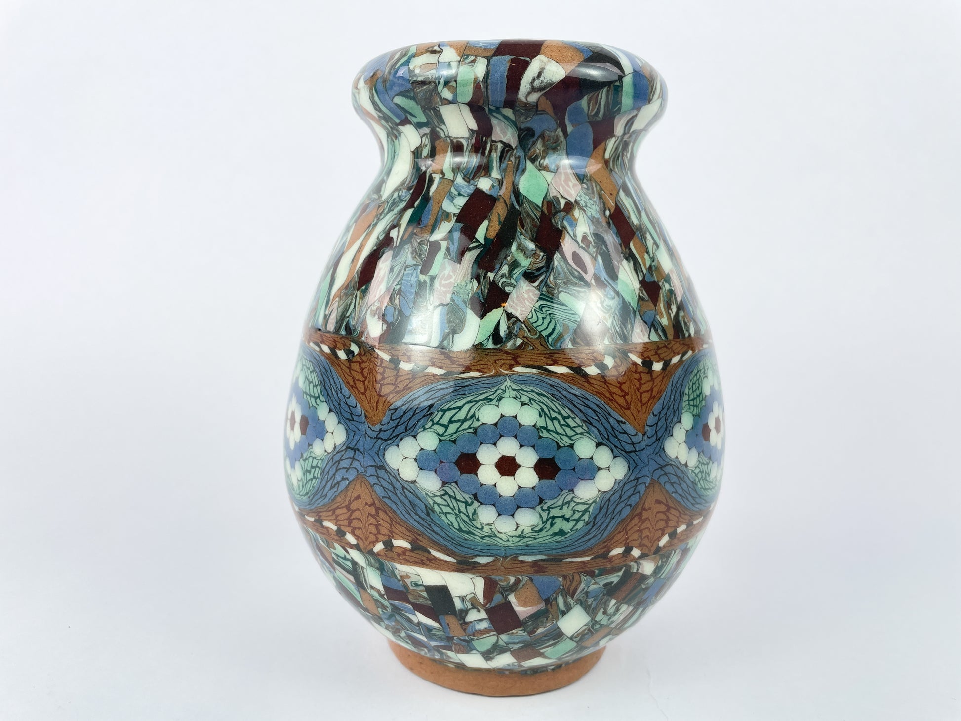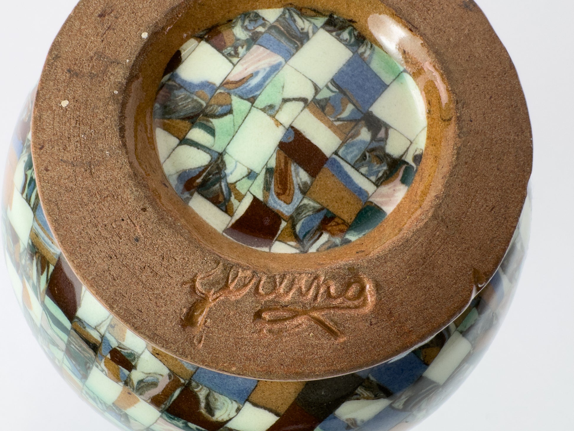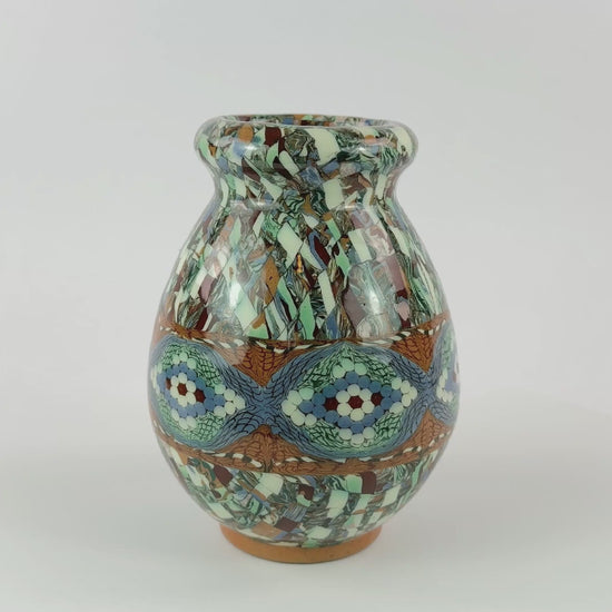 Rather than relying on surface decoration or glaze, Gerbino constructed patterns from carefully assembled fragments of colored clay, creating dense, marble-like surfaces with exceptional depth and movement. This vase displays a finely balanced polychrome geometric composition in tones of green, blue, ochre, and warm brown. The softly rounded body and gently flared neck give the piece a calm, sculptural presence.
