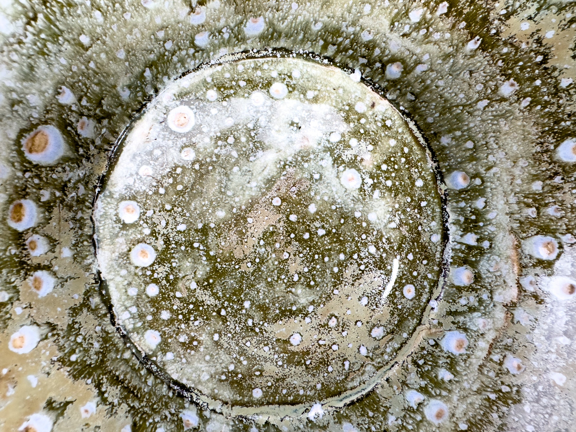 The interior glaze displays characteristic crystalline effects—organic blooms, micro-crystals, and subtle color transitions—typical of experimental French ceramic production from the early to mid-20th century. The gently undulating rim adds a hand-shaped, studio-art quality that enhances the sculptural presence of the piece.