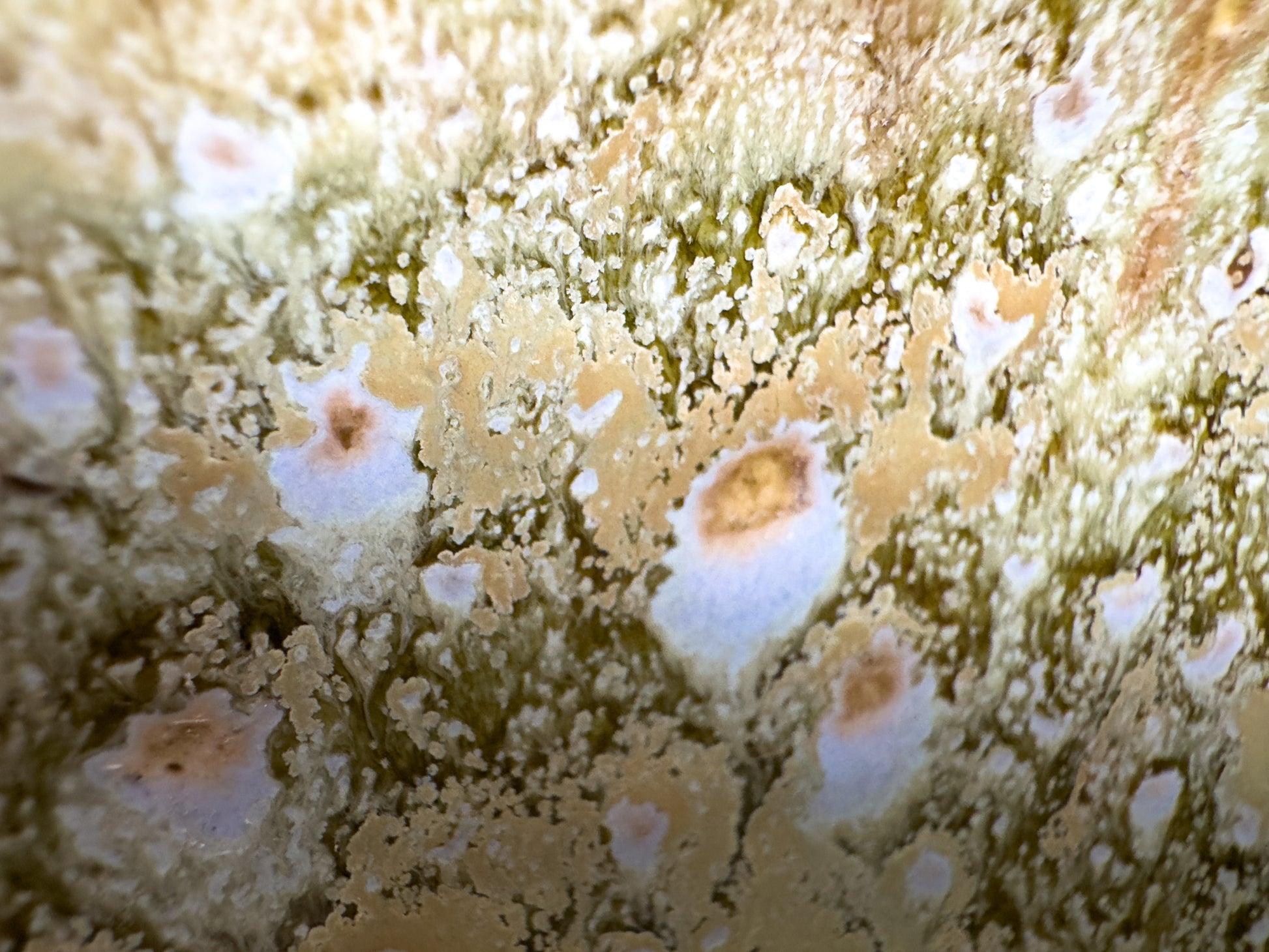 A striking large French art pottery bowl, attributed to the Faïencerie de Pierrefonds, featuring a richly textured crystalline-style glaze applied to the interior in nuanced tones of olive green, soft white, and warm amber. The exterior presents a smooth, matte finish that contrasts beautifully with the luminous, mineral surface within.