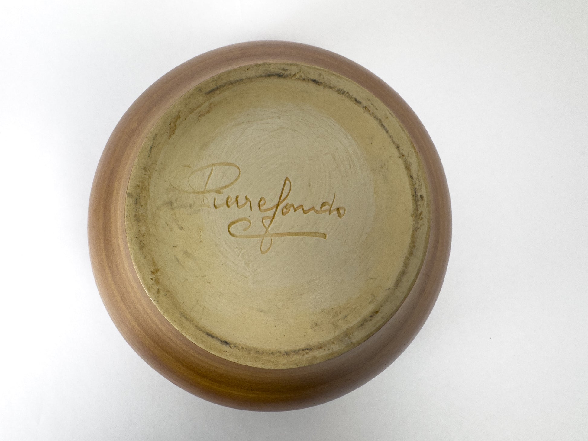 Signed “Pierrefonds” on the base, this bowl is offered with careful attribution. While it does not bear the heraldic shield stamp sometimes associated with the manufacture, the signature and glaze technique are consistent with works attributed to Pierrefonds.