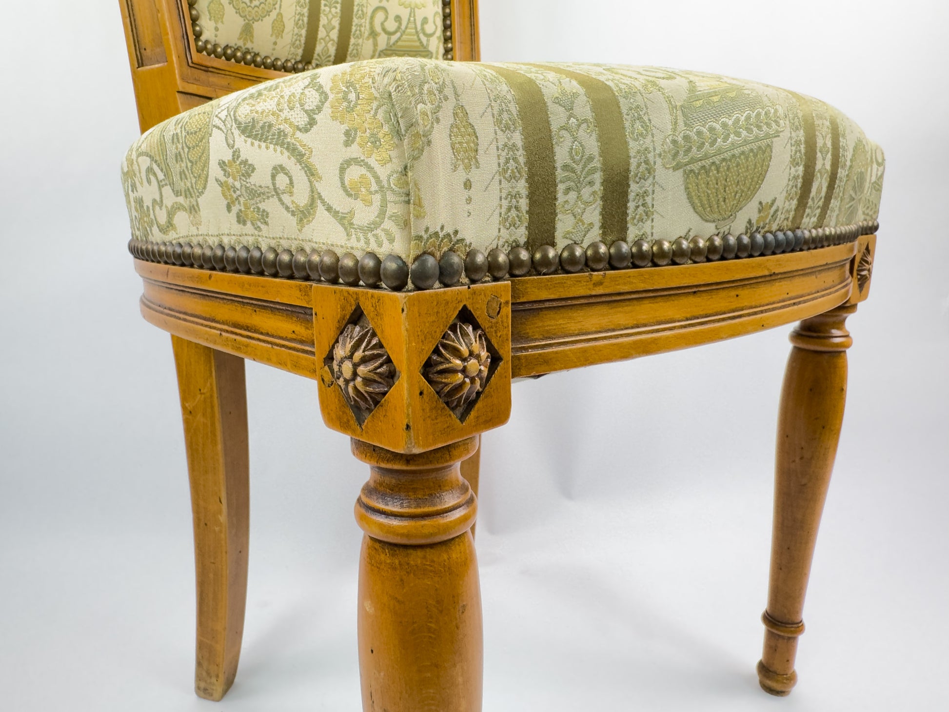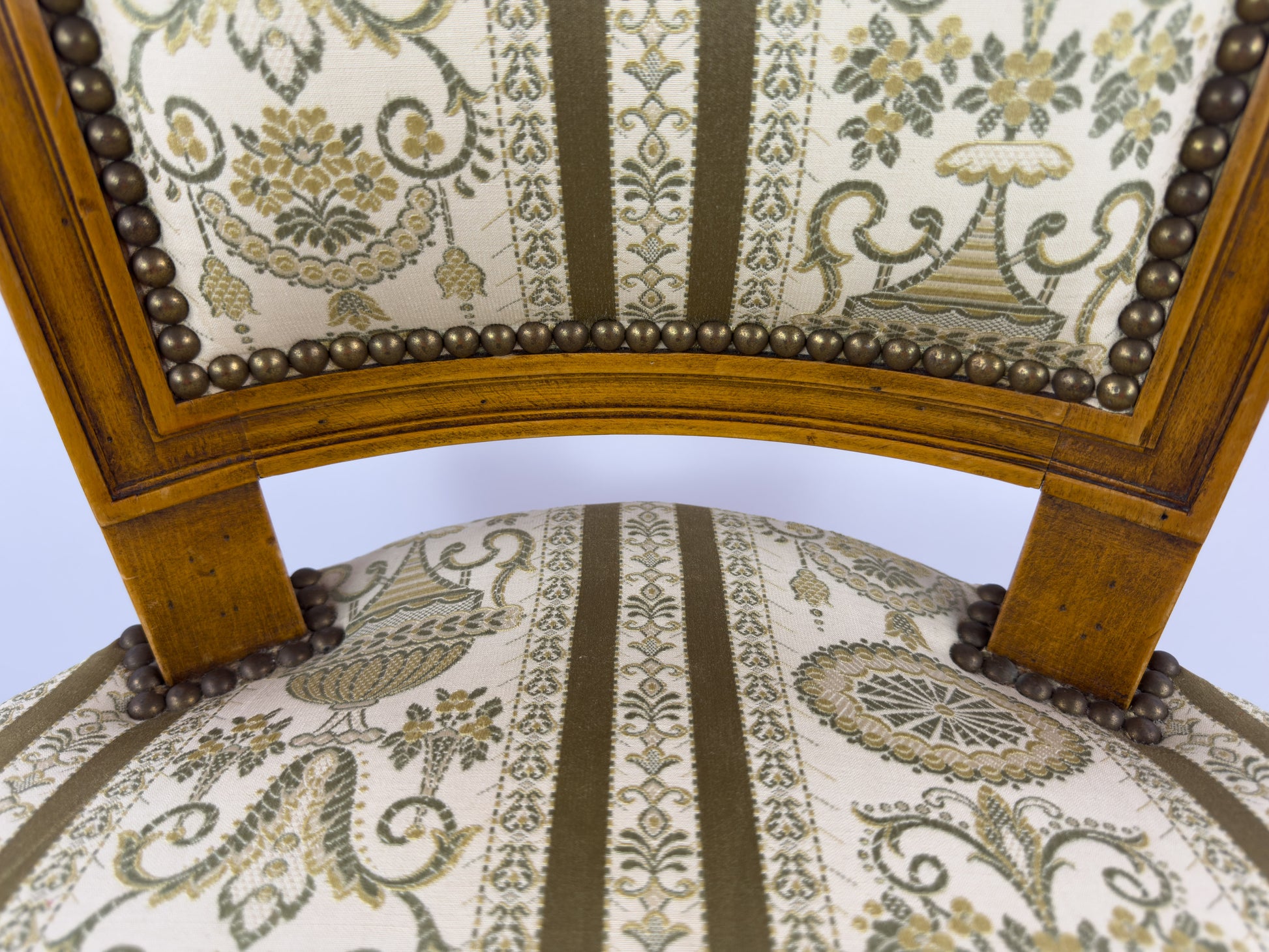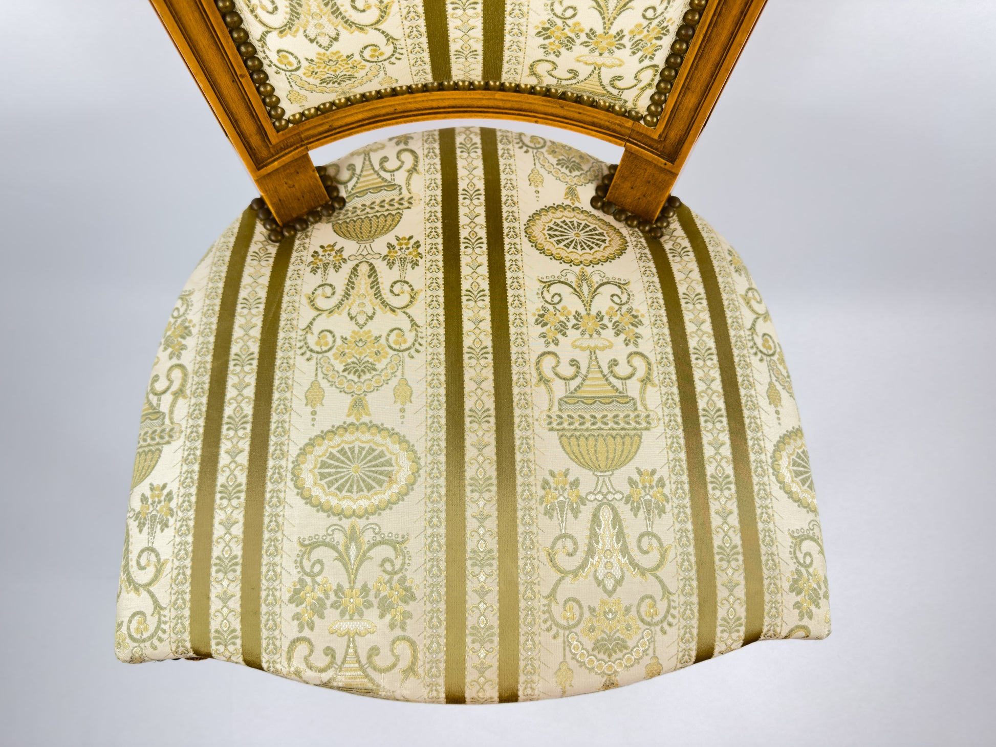 The chair is upholstered in a highly refined Directoire-style silk tapestry, featuring neoclassical motifs in soft green and gold tones. The upholstery is neatly finished with decorative nailhead trim and offers a comfortable, high-quality seat. The overall impression is one of understated sophistication, typical of late 18th-century design revived during the 19th century.