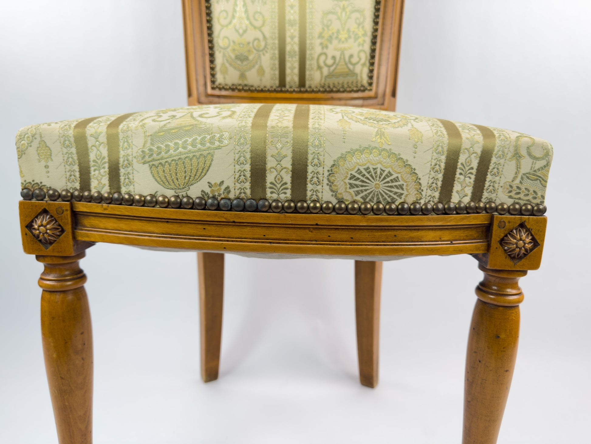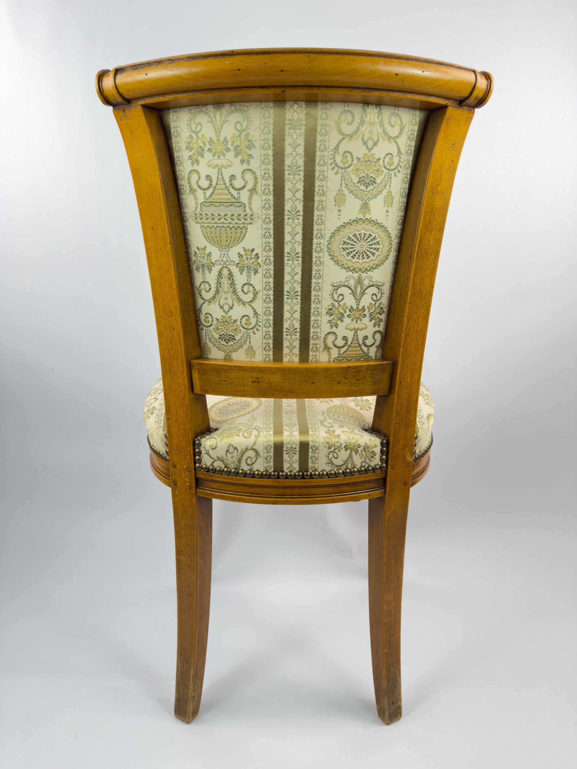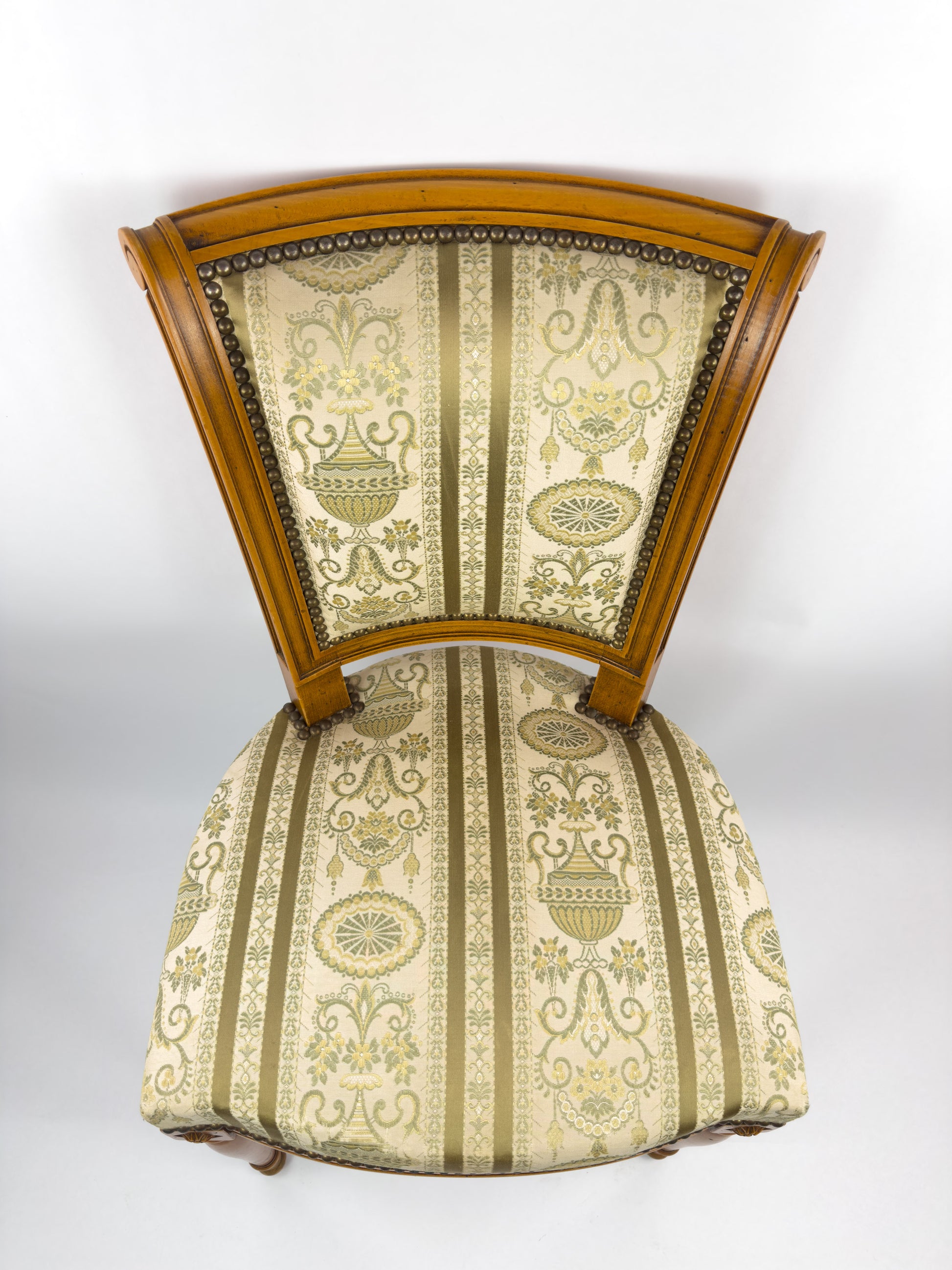 The chair is upholstered in a highly refined Directoire-style silk tapestry, featuring neoclassical motifs in soft green and gold tones. The upholstery is neatly finished with decorative nailhead trim and offers a comfortable, high-quality seat. The overall impression is one of understated sophistication, typical of late 18th-century design revived during the 19th century.