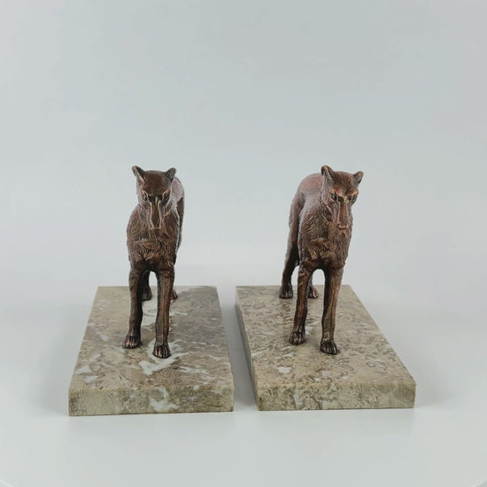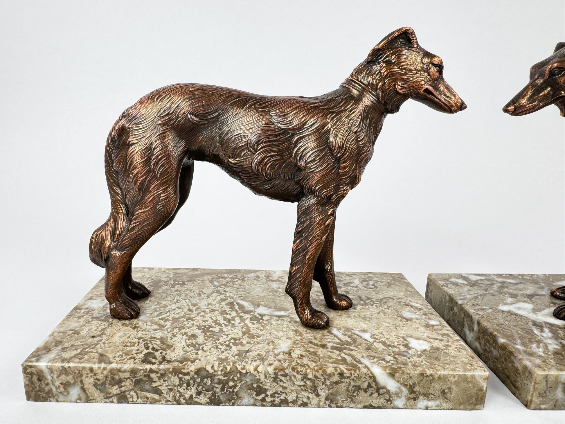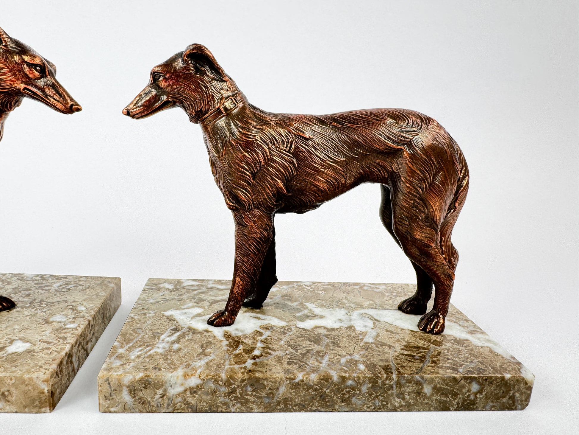 Elegant pair of French Art Deco bookends depicting mirrored Barzoi (Borzoi) dogs, circa 1930. Cast spelter figures with a warm bronze/copper patina, mounted on their original veined marble bases. The elongated muzzles and stylised movement of the fur are characteristic of the Art Deco period. Original leather undersides present. Decorative yet functional, ideal for shelving or desk styling.