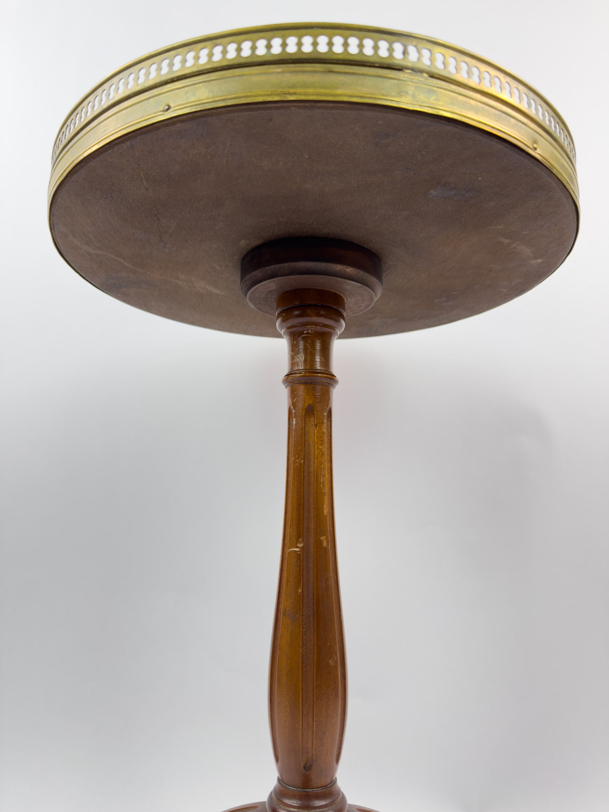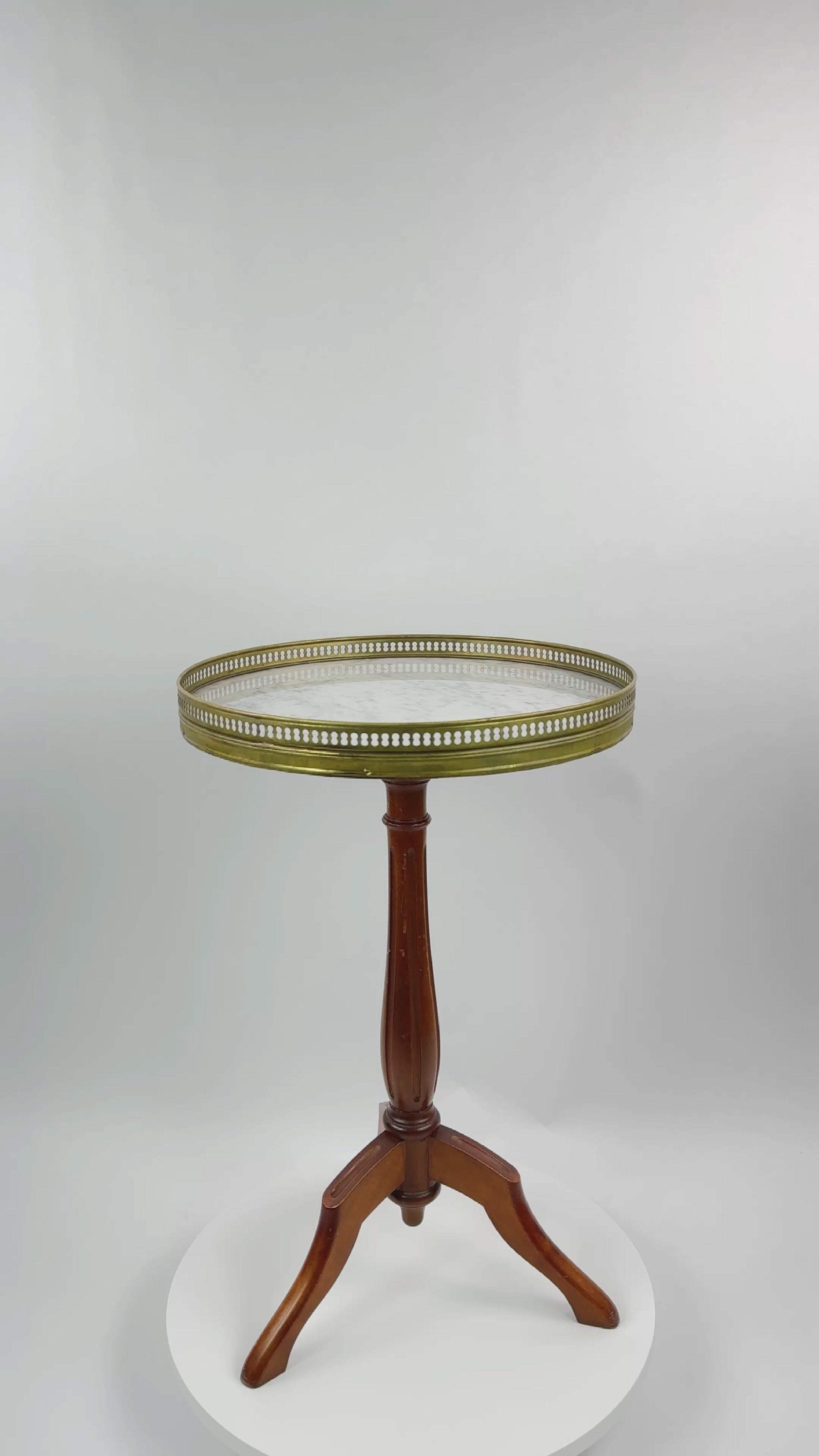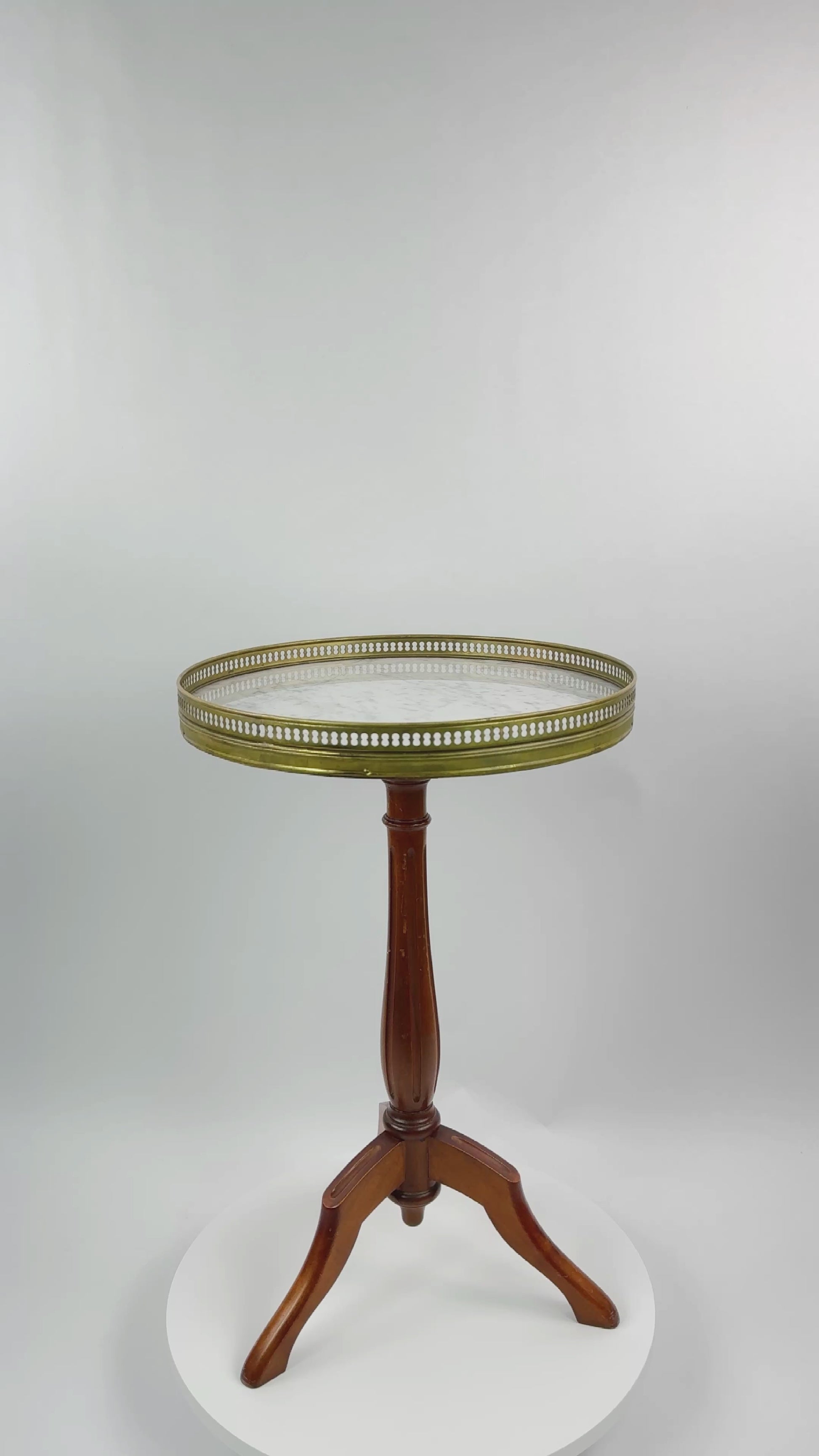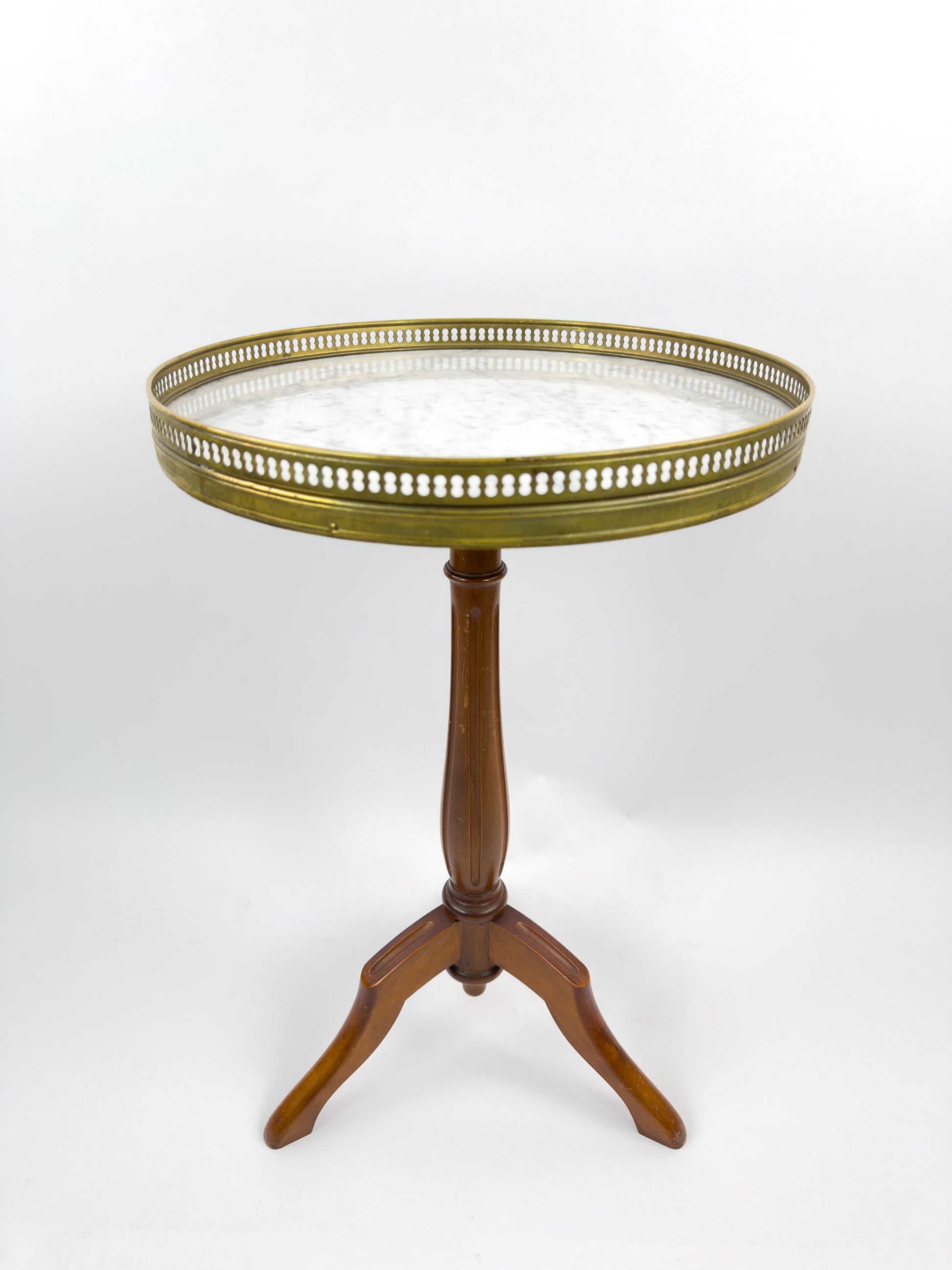 An elegant vintage French guéridon, also suitable as a side table, featuring a circular Carrara marble top framed by a pierced brass gallery. The table rests on a finely turned central column with three gently splayed legs, showcasing restrained classical detailing and balanced proportions. The warm-toned wood presents a rich patina, complemented by the soft veining of the marble and the aged character of the brass surround.