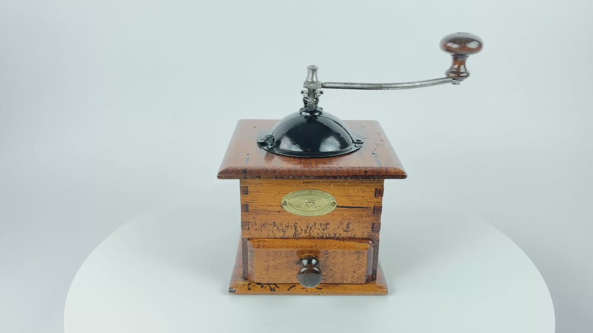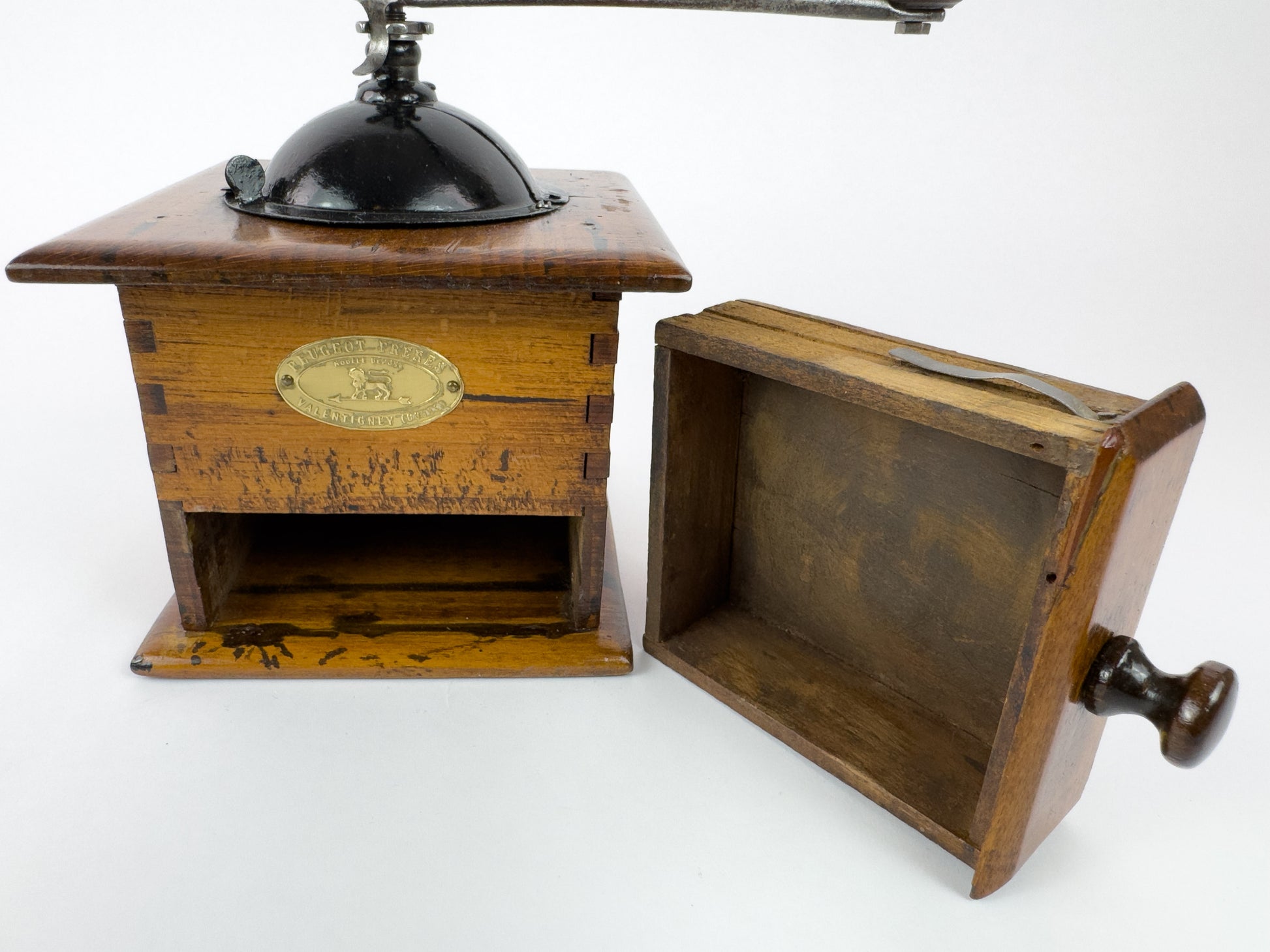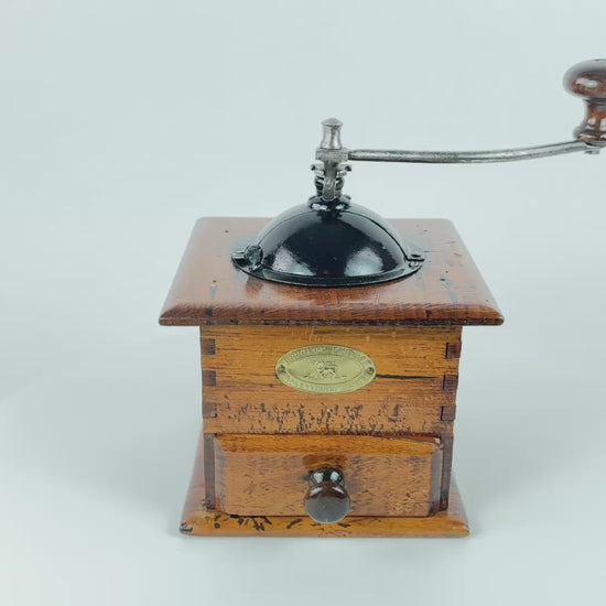 Authentic vintage manual coffee grinder by Peugeot Frères, featuring a solid wooden body, metal hopper, and original hand-crank mechanism. This classic model reflects Peugeot’s long tradition of precision engineering applied to everyday objects.